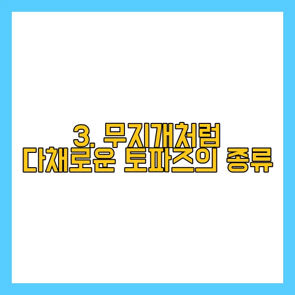 토파즈는 마치 무지개처럼 다양한 색상으로 우리를 매료시킵니다. 각 색상마다 고유의 아름다움과 상징성이 담겨 있으니, 취향에 맞는 토파즈를 찾아보는 재미도 쏠쏠할 거예요!